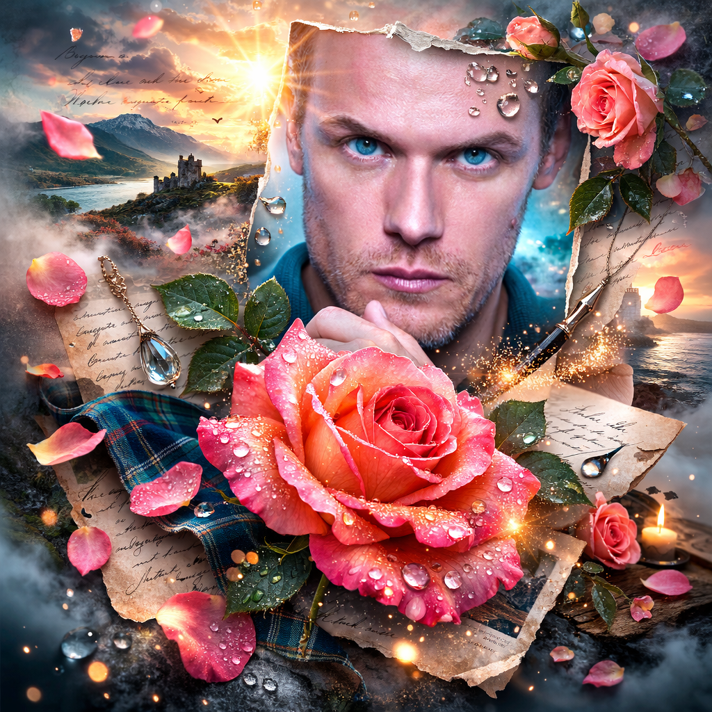 When I begin to create from one of his images, it doesn’t come from a structured plan or a need to produce something specific. It begins with a feeling that I can’t ignore. Sometimes that feeling is softness, something warm and steady that feels like it deserves to be protected and held gently. Other times it’s strength, not the kind that is loud or forceful, but the kind that is carried quietly over time without needing recognition. There are moments when it feels deeper than that—like a sense of responsibility, or the weight of continuing forward even when things aren’t easy. Without even realizing it, I start asking myself what that feeling would look like if it could be seen. That’s when the layers begin to form. Light might wrap around him because the presence feels warm and constant. Roses might appear because growth, resilience, and care feel like part of that emotional understanding. Scottish textures or landscapes might weave into the image because where someone comes from is part of their foundation, part of their identity, part of their shape. Nothing I create is random. Every detail comes from something I felt first. Because I’m not trying to recreate him—I’m responding to him, and in doing that, I’m continuing to celebrate what I see in a way that feels natural to me.